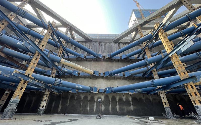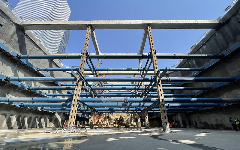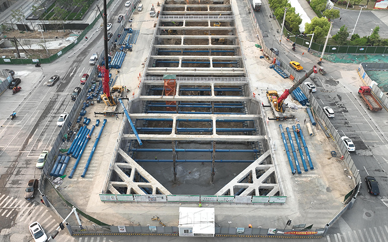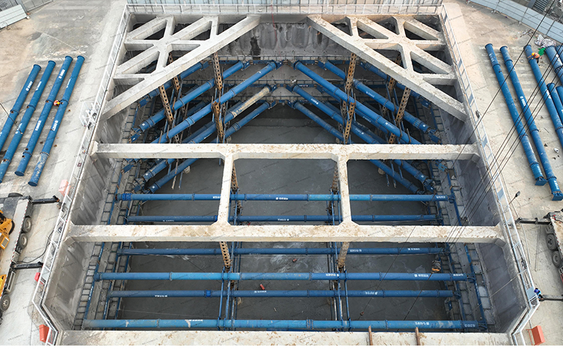 雙層段基坑深度17m,縱向長度32m,橫向長度33.8m。深基坑作業(yè)危險因素眾多,為保障基坑安全開挖,項目在開挖前進行多次模擬推演,預(yù)估風(fēng)險源并不斷優(yōu)化施工方案。開挖過程中遵循時空效應(yīng),采取“先撐后挖、水平分段、豎向分層”原則,做到“分層、分步、對稱、平衡、限時”五個要點,雙層下穿段土方量1.9萬m3,經(jīng)過連續(xù)作業(yè)4月16日完成基坑開挖并通過五方責(zé)任主體單位基坑驗槽,4月19日完成墊層混凝土澆筑。