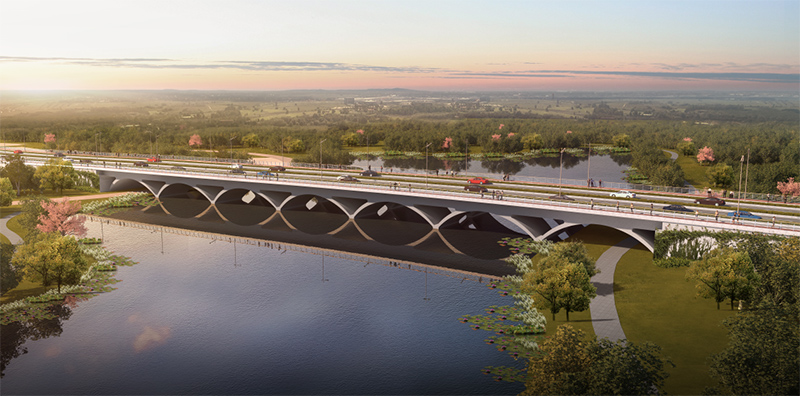 黃河路以“穿透共融、自然綠苑”為設(shè)計(jì)理念,融入自然與城市的生態(tài)廊道、見(jiàn)水見(jiàn)林不見(jiàn)路的景觀綠道。道路兩旁兩側(cè)栽植800多棵高桿櫻花樹(shù),花期在每年3月中旬,觀賞期為15天左右,屆時(shí)將成為名副其實(shí)的“櫻花大道”。同時(shí)工程包含一座187米的七跨連拱橋,橫跨錦繡東湖,造型優(yōu)美,輕盈靈動(dòng)。
