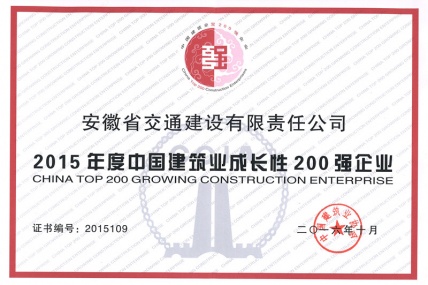 安徽交建榮獲“中國(guó)建筑業(yè)成長(zhǎng)性200強(qiáng)企業(yè)”榮譽(yù)稱號(hào)