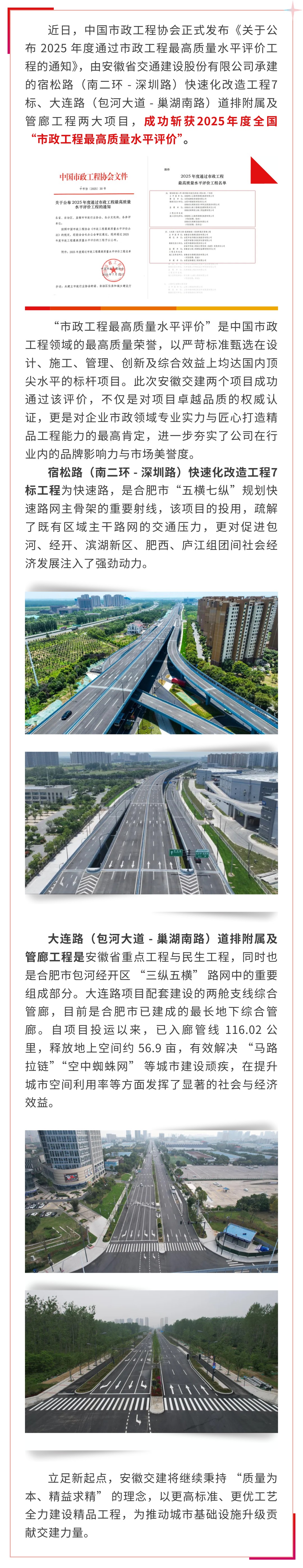 喜報!安徽交建兩項目斬獲2025年度市政工程最高質(zhì)量水平評價